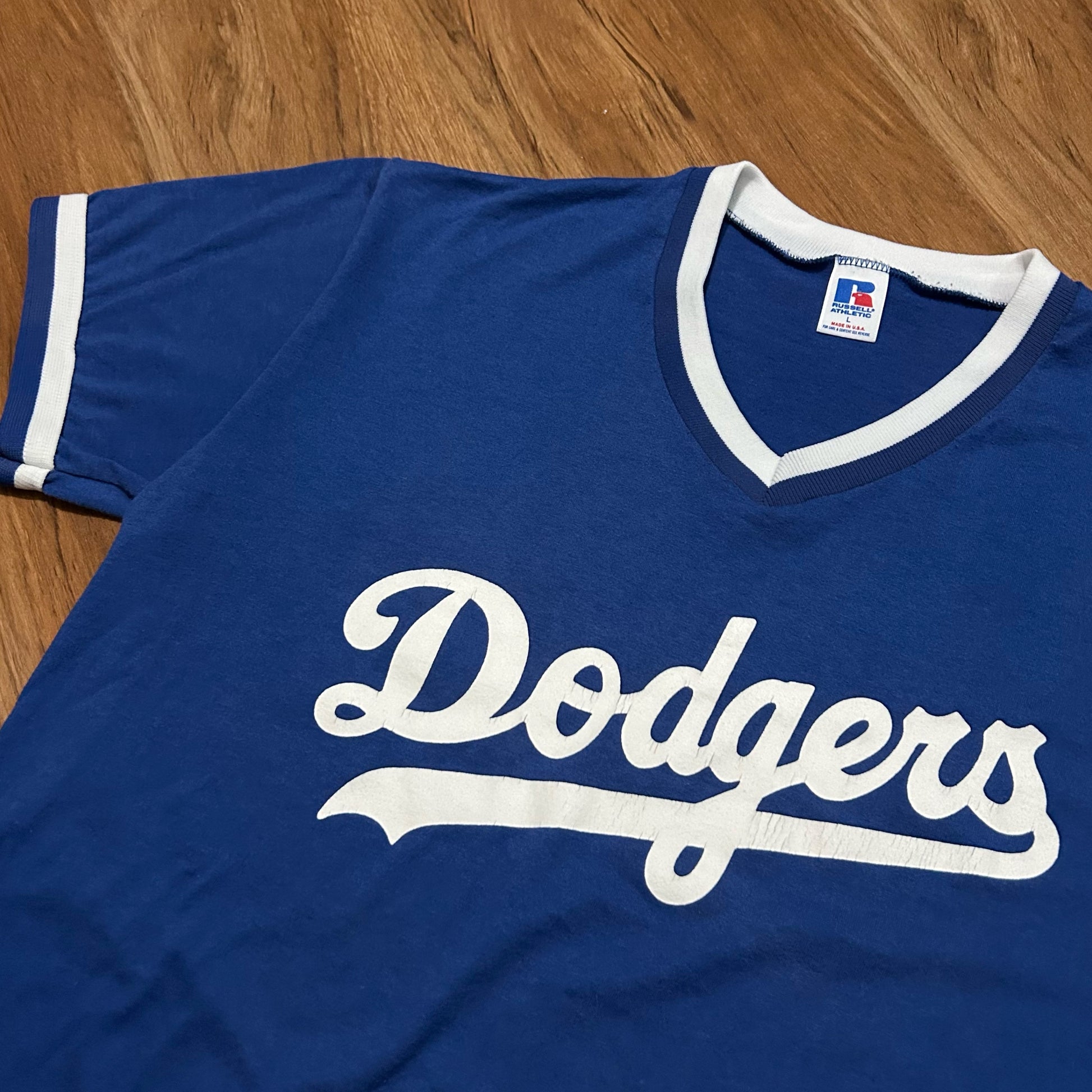 (L) Vintage 90s Russell Athletic Los Angeles Dodgers V-Neck Ringer Blue Jersey Shirt
